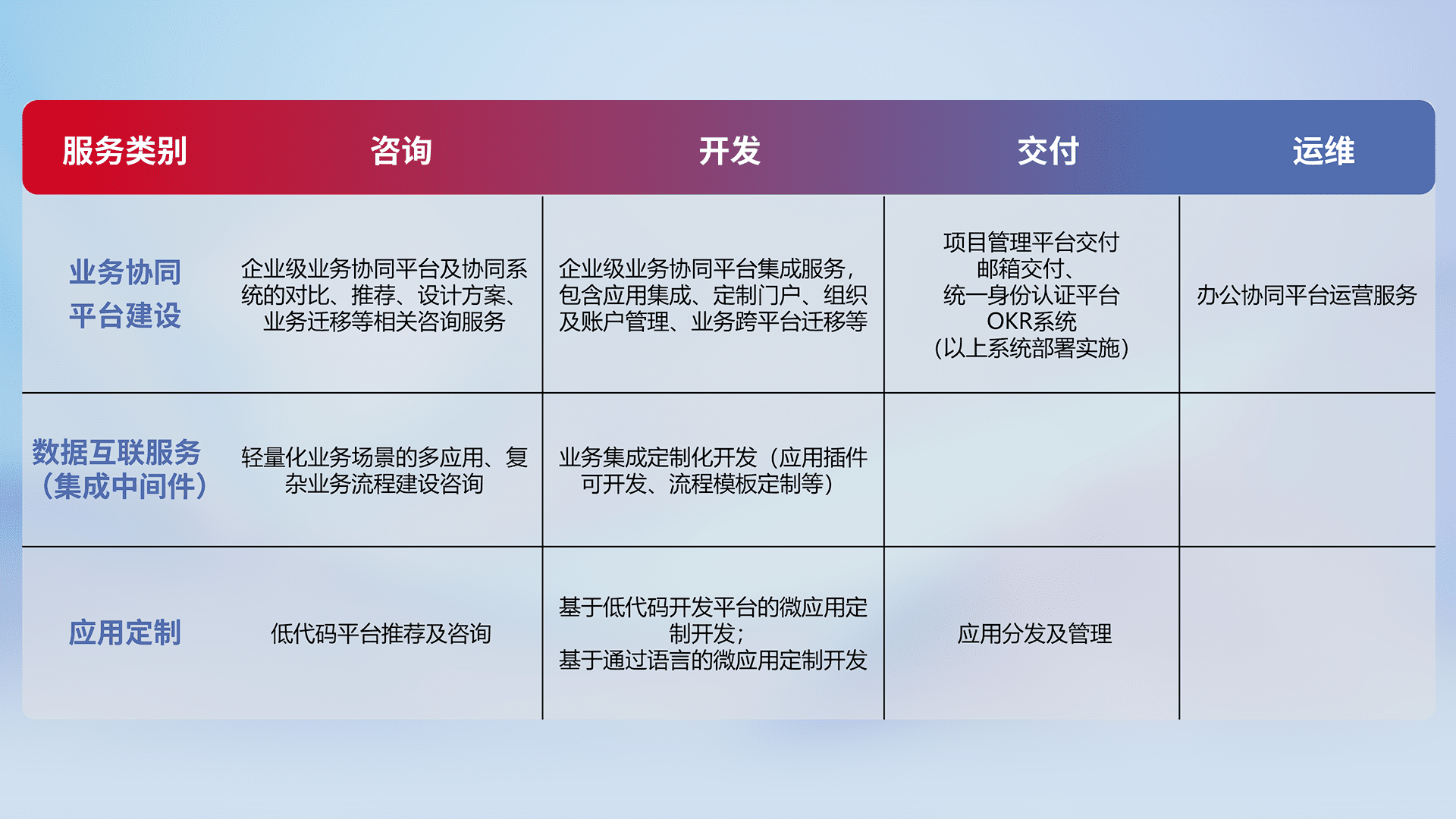 针对钉钉、、、企微、、IDaas等平台级产品提供产品的规划、、、方案、、、、交付、、、、定制化开发等服务,,,,实现如统一协同办公、、、、智能客户服务、、、、混合会议管理、、、智能数据查询、、、等业务场景,,,,实现数字化转型。。。